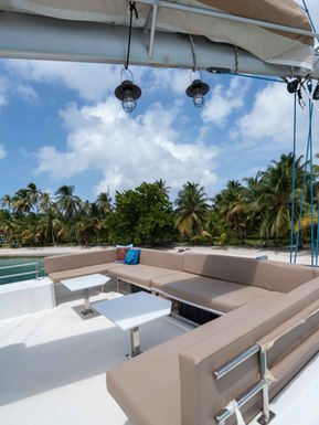 Este impresionante catamarán cuenta con 6 camarotes dobles, cada uno con baño privado y aire acondicionado, además de un amplio cockpit para relajarte a la sombra y un flybridge lounge perfecto para tomar el sol y disfrutar de los atardeceres.