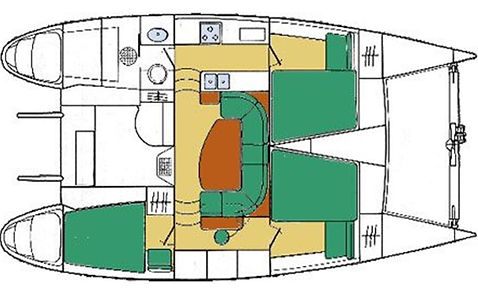 Con capacidad para hasta 6 personas, este acogedor catamarán ofrece 3 habitaciones dobles y un baño compartido, ideal para disfrutar en pareja o en grupos pequeños.